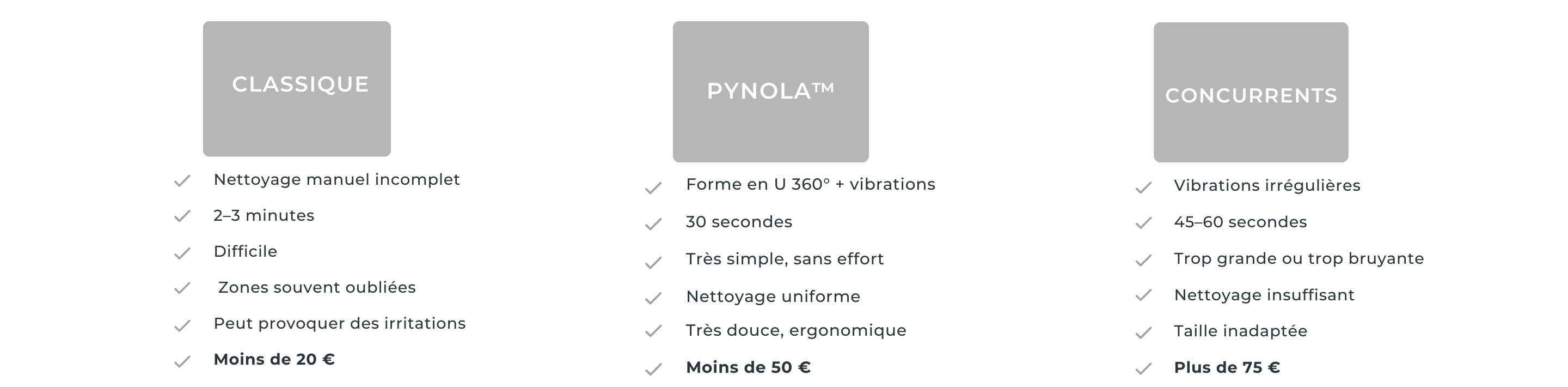 Avec PYNOLA™, je me brosse les dents en seulement 30 secondes, sans aucun effort. Mes dents n’ont jamais été aussi propres.